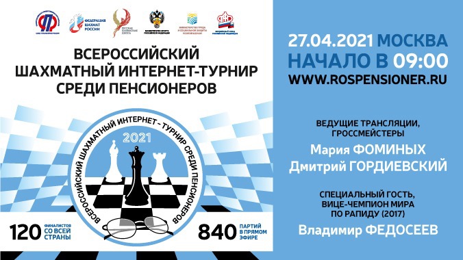 27 апреля 2021 года состоится Всероссийский шахматный лично-командный интернет-турнир среди пенсионеров.